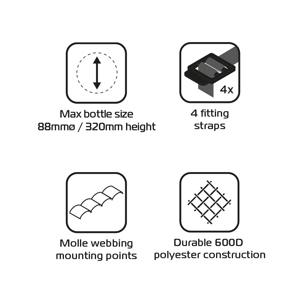 Βασικά χαρακτηριστικά • Ρυθμιζόμενος φορέας για νερο και καύσιμα • Μέγιστο μέγεθος φιάλης 88 mm / 320 mm ύψος • 4 ρυθμιζόμενοι ιμάντες προσαρμογής • Σημεία στερέωσης ιμάντων Molle • Ανθεκτική κατασκευή 600D Polyester