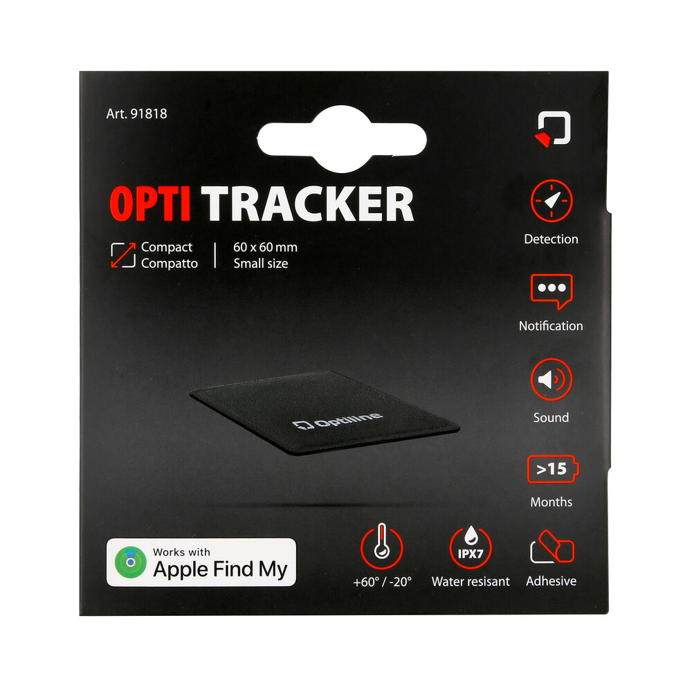 Το δίκτυο Apple Find My παρέχει έναν εύκολο και ασφαλή τρόπο εντοπισμού συμβατών προσωπικών αντικειμένων σε χάρτη, χρησιμοποιώντας την εφαρμογή Find My στο iPhone, iPad, iPod touch, Mac, ή την εφαρμογή Find Items στο Apple Watch. Απλά συνδέστε το Opti Tracker Compact σας με την εφαρμογή Apple Find My για να το δείτε μαζί με τις συσκευές Apple σας. Εάν το αντικείμενό σας χαθεί, μπορείτε να το θέσετε σε Κατάσταση Απώλειας για να εμφανιστεί ένα μήνυμα και τα στοιχεία επικοινωνίας σας σε όποιον το βρει !!