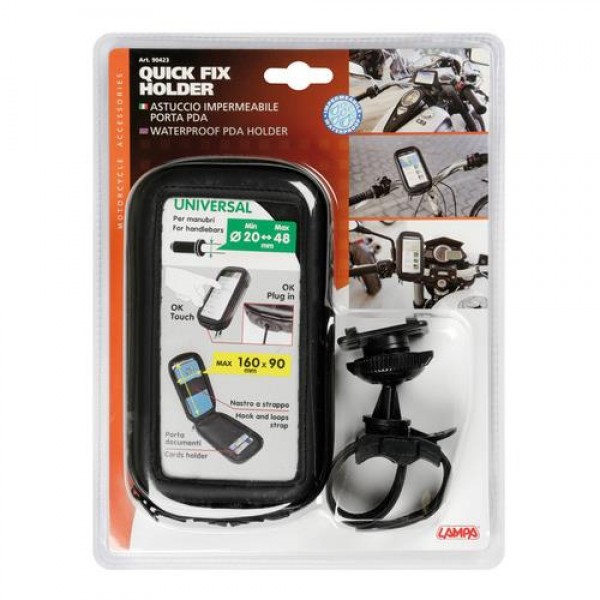 Βάση στήριξης για τηλέφωνο ή το σύστημα πλοήγησης (GPS), ιταλικής προέλευσης από την εταιρία LAMPA.Η βάση στήριξης διαθέτει πλαστικοποιημένο εύκαμπτο ιμάντα με αντιολισθητικό υλικό για να προσαρμόζεται και να τοποθετείται με ειδικό κλιπ πάνω στο τιμόνι της μηχανής σας σταθερά και με απόλυτη ασφάλεια. Η Θήκη της βάσης στήριξης διαθέτει οθόνη με λειτουργία συστήματος αφής (touch screen) και υποδοχή για καλώδιο φόρτισης της συσκευής για να φορτίζει παράλληλα ενώ βρίσκεται σε χρήση μέσα στην θήκη. Στο εσωτερικό της θήκης υπάρχει ελαστικός ιμάντας συγκράτησης της συσκευής αλλά και 2 υποδοχές για πιστωτικές ή χρεωστικές κάρτες.