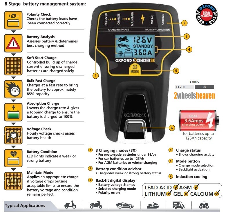 Βασικά χαρακτηριστικά • Λειτουργία φόρτισης ομαλής εκκίνησης για βελτίωση της ανάκτησης μπαταριών βαθιάς αποφόρτισης έως και 8 βολτ • Κατάλληλο για όλες τις μπαταρίες Αυτοκινήτων 12V συμπεριλαμβανομένων των μπαταριών Μοτοσικλετών LITHIUM LiFePO4 • Οι νέοι αισθητήρες τάσης εντοπίζουν γρήγορα την υψηλή ροή ρεύματος και θα επανέλθουν αυτόματα στον πιο κατάλληλο ρυθμό φόρτισης