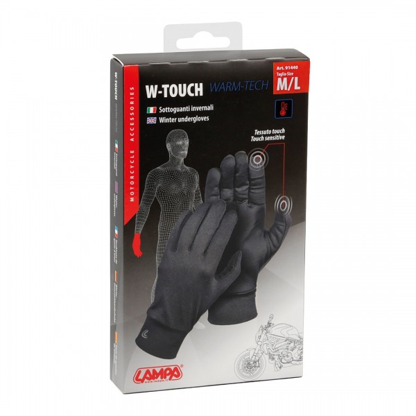 Γάντια άριστης εφαρμογής και μαλακά στην υφή W-Touch, κατασκευασμένα από ειδικές πολυεστερικές ίνες με υψηλή ελαστικότητα, ιταλικής προέλευσης από την εταιρία Lampa. Ιδανικά για τους κρύους μήνες του χειμώνα εξαιτίας της εσωτερικής ζεστής επένδυσης που διαθέτουν. Προστατεύουν τα χέρια σας από την εφίδρωση και τα διατηρούν στην φυσιολογική θερμοκρασία του σώματός σας. Τα γάντια μηχανής W-Touch σας παρέχουν την δυνατότητα αίσθησης αφής (Touch sensitive) για να δίνετε εντολές αφής στις ηλεκτρονικές συσκευές που διαθέτουν οθόνη (GPS navigators, tablets και κινητά τηλέφωνα-smartphones), ενώ τα φοράτε.