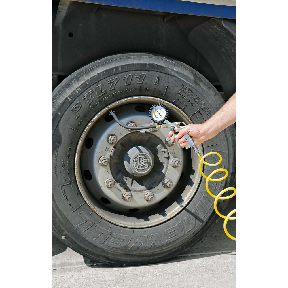 Ο συγκεκριμένος μετρητής έχει μεταλλική υποδοχή για να μπαίνει σε αεροσυμπιεστή ( κομπρεσέρ αέρα ) καθώς και πιστόλι για εισροή και απελευθέρωση αέρα στο ελαστικό.